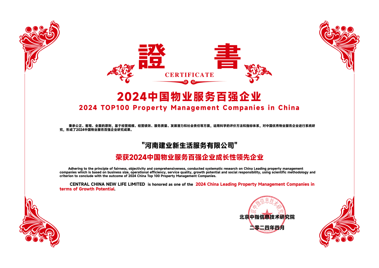 2024年是建業(yè)物業(yè)成立三十周年,公司將繼續(xù)秉承成熟的服務(wù)體系和專業(yè)的運(yùn)營策略,堅(jiān)持“根植中原,造福百姓”的核心理念,在變革中不斷創(chuàng)新,全心全意為業(yè)主提供更優(yōu)質(zhì)、更便捷的物業(yè)服務(wù)。展望未來,建業(yè)新生活將始終以業(yè)主需求為核心,以創(chuàng)新為驅(qū)動(dòng)力,以優(yōu)質(zhì)服務(wù)為紐帶,推動(dòng)物業(yè)服務(wù)行業(yè)的持續(xù)升級和發(fā)展。