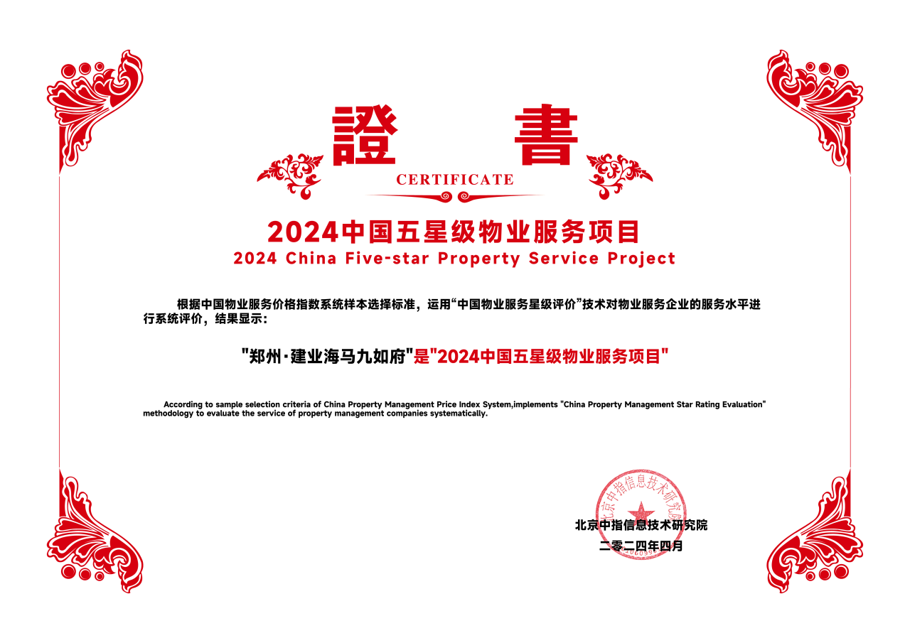 同時(shí),建業(yè)新生活旗下在管項(xiàng)目鄭州·建業(yè)海馬九如府、南陽·建業(yè)壹號城邦榮獲“2024中國五星級物業(yè)服務(wù)項(xiàng)目”稱號。
