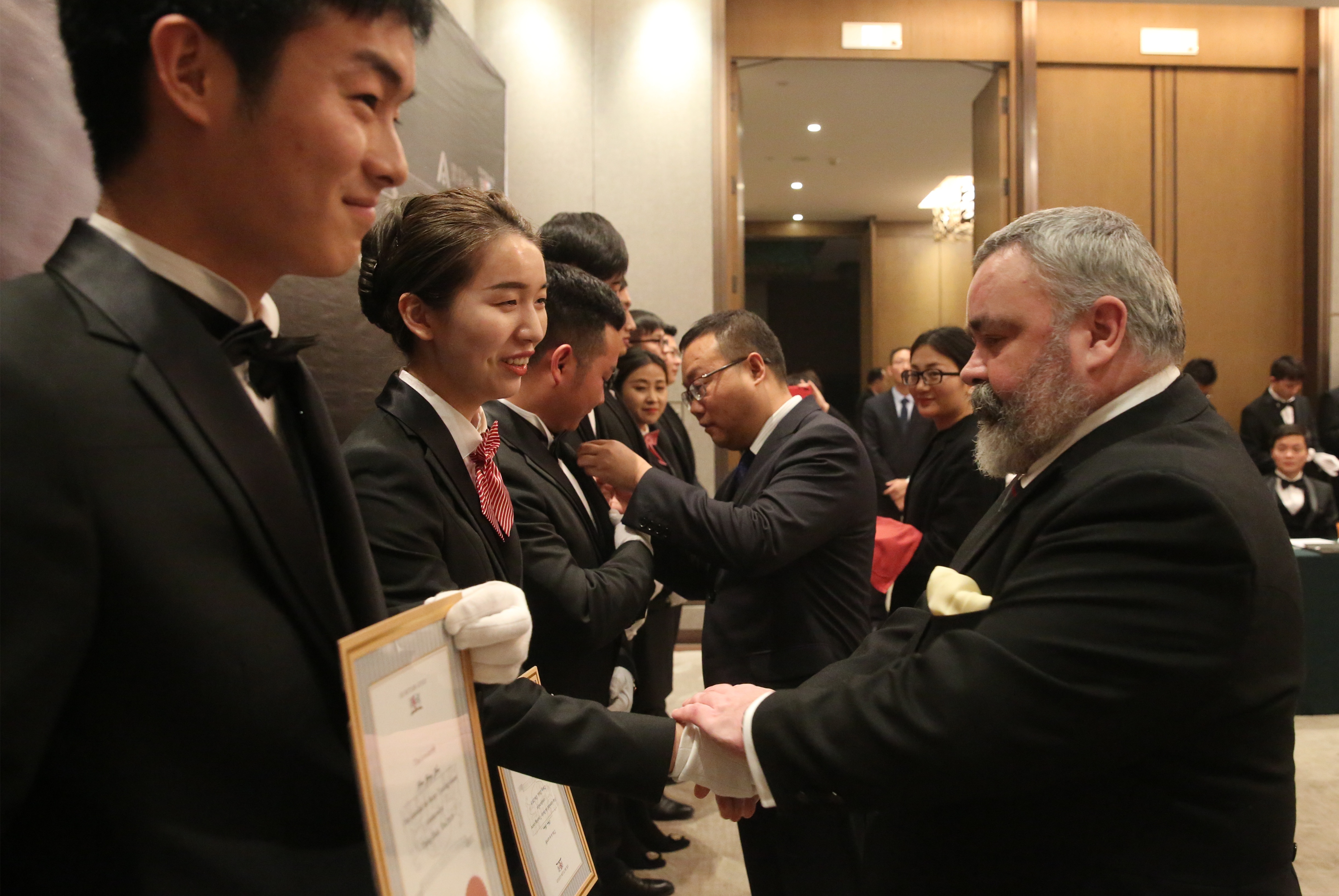 結業(yè)典禮上,建業(yè)物業(yè)負責人張禮輝致辭并為學員們授徽,英國管家協(xié)會大中華區(qū)的安東尼老師則為學員們頒發(fā)了由英國管家協(xié)會認證的國際管家證書。