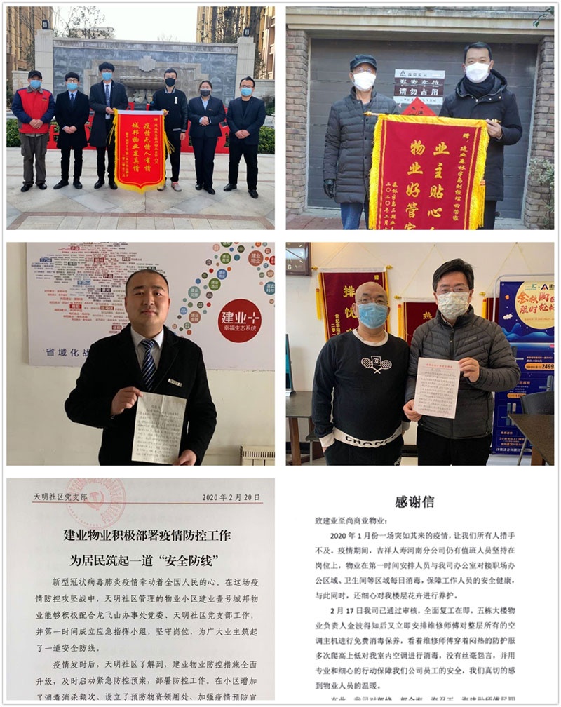 2020年春節(jié)前后,一場突如其來的疫情席卷全國,建業(yè)物業(yè)在管的近300個(gè)小區(qū)第一時(shí)間啟動(dòng)一級響應(yīng),一萬多名建業(yè)物業(yè)人紛紛主動(dòng)放棄春節(jié)假期,陸續(xù)奔赴到崗。在這場全民戰(zhàn)“疫”的行動(dòng)中,涌現(xiàn)出一批批令人感動(dòng)而印象深刻的人和事。2月,建業(yè)物業(yè)在管小區(qū)共涌現(xiàn)出疫情防控、拾金不昧、技藝高超、熱情服務(wù)、助人為樂等各類好人好事共計(jì)253例,其中收到錦旗25面,感謝信69封,來電感謝及其他159起。