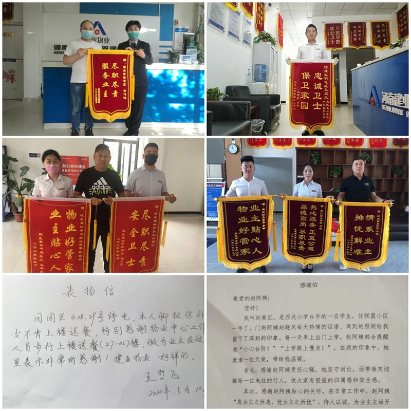 5月,建業(yè)物業(yè)各分支機構共發(fā)生好人好事627件,其中錦旗148面,感謝信181封,致電表揚等形式308次。