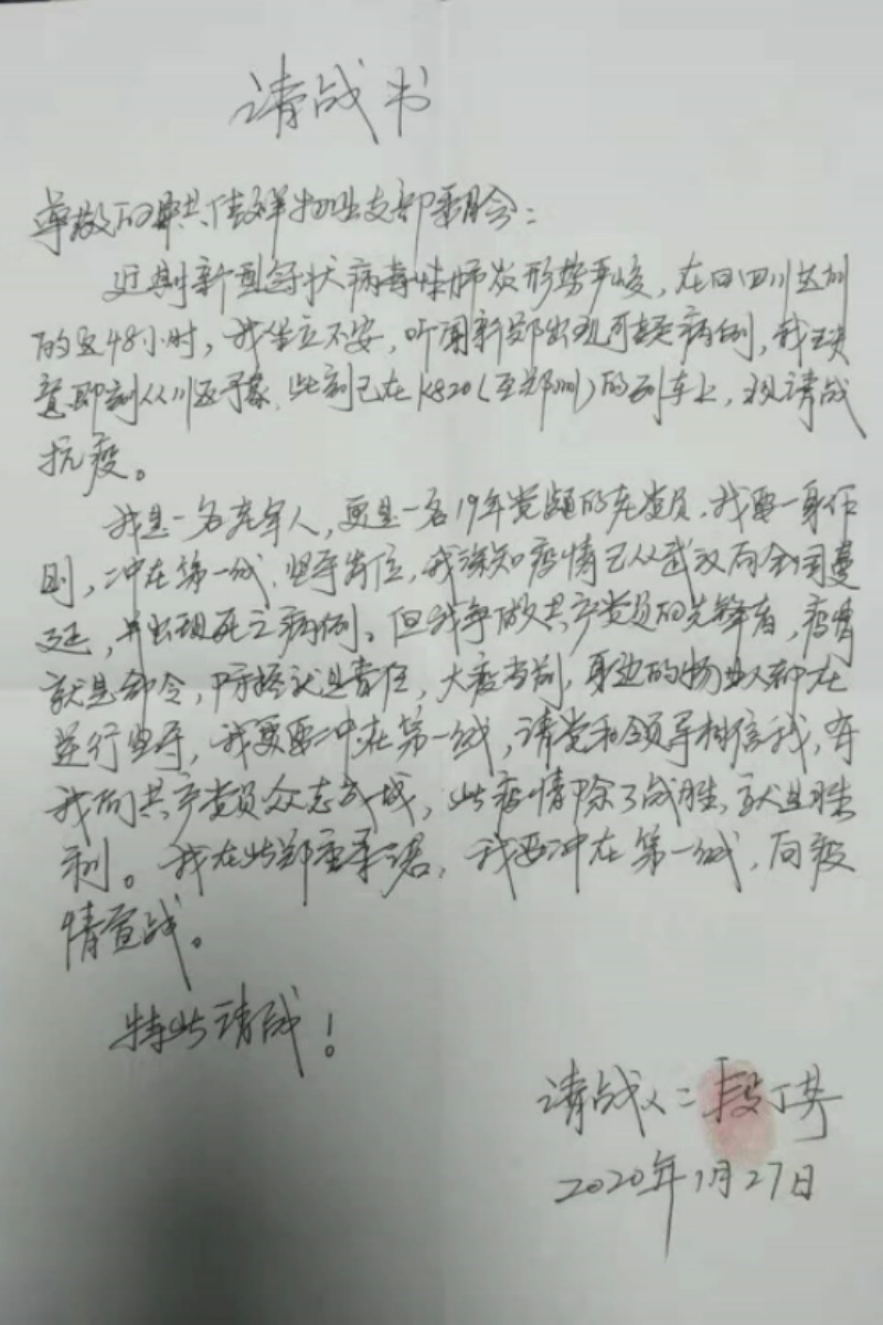 但想到了20年前入黨時的誓詞,他堅定上前,并在回崗的火車上寫下了請戰(zhàn)書:“我鄭重承諾,我必須回到防疫第一線,向疫情宣戰(zhàn)!”正是靠著這份承諾,讓他堅定了抗擊疫情必勝的信心。