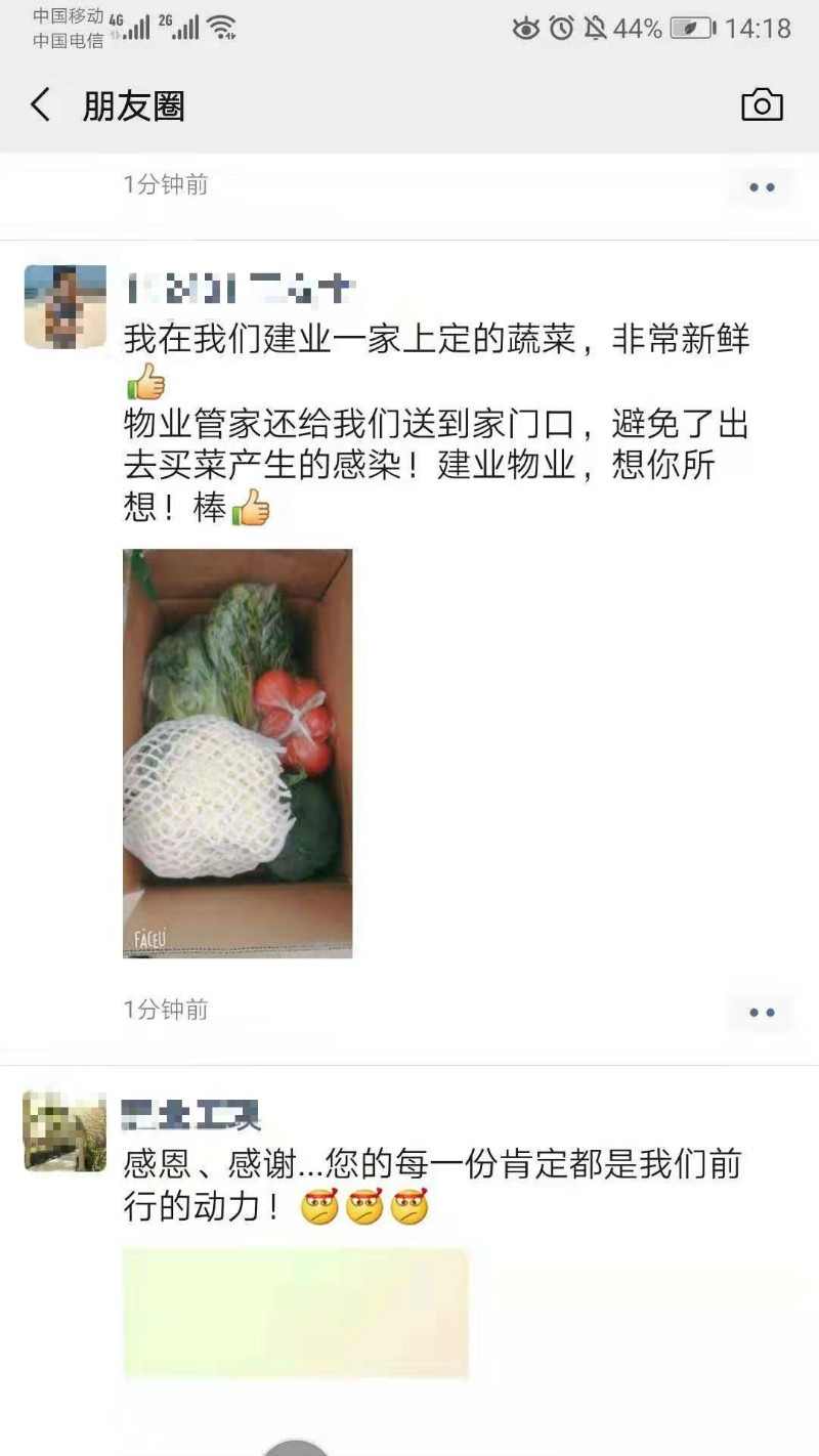 隨著疫情警報(bào)的持續(xù)拉緊,被困在家中的人們?nèi)粘I畋U铣闪穗y題。在防控疫情的特殊時(shí)期,為解決業(yè)主的生活難題,讓業(yè)主足不出戶就能吃上新鮮的蔬菜,購買到必需的民生物品,建業(yè)物業(yè)至誠園區(qū)公司協(xié)同建業(yè)+、一家公社、建業(yè)新生活農(nóng)業(yè)發(fā)展公司,接力為業(yè)主提供“建業(yè)+最后一公里”服務(wù),將建業(yè)+豐盛幸福生活切實(shí)帶到業(yè)主身邊。