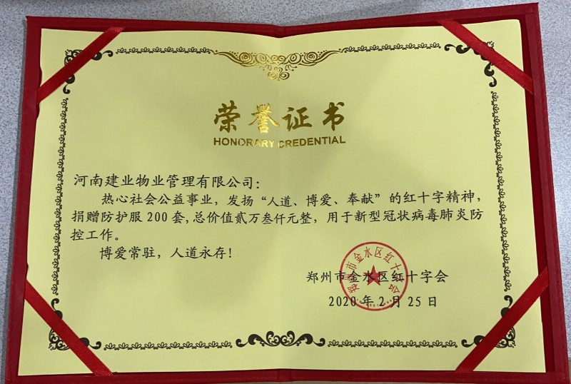 熱心社會(huì)公益,踐行企業(yè)責(zé)任!繼2月3日向武漢市物業(yè)管理協(xié)會(huì)捐贈(zèng)84消毒液5噸、噴壺300余個(gè)、一次性手套25000余雙、酒精600瓶之后,建業(yè)物業(yè)于2月25日向鄭州市金水區(qū)紅十字會(huì)捐贈(zèng)防護(hù)服200套,為城市一線防疫工作盡一份綿薄之力。