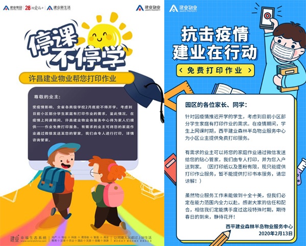 因?yàn)橐咔橛绊懀聦W(xué)期開學(xué)時(shí)間推遲,為了不耽誤孩子的學(xué)習(xí),不少學(xué)校采取了線上教學(xué)的模式。建業(yè)物業(yè)也未停下腳步,免費(fèi)打印作業(yè)、代買學(xué)習(xí)用品、寄送學(xué)習(xí)資料……全力保障業(yè)主孩子在假期的學(xué)習(xí)質(zhì)量。