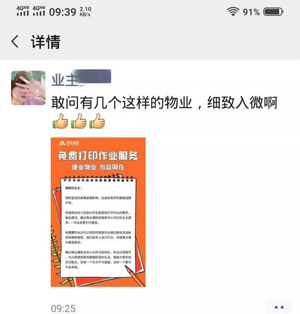 “建業(yè)物業(yè)的一條龍服務(wù)太暖心了,園區(qū)消殺、代購蔬菜一樣沒少,現(xiàn)在還有打印作業(yè)的暖心服務(wù),太贊了!”