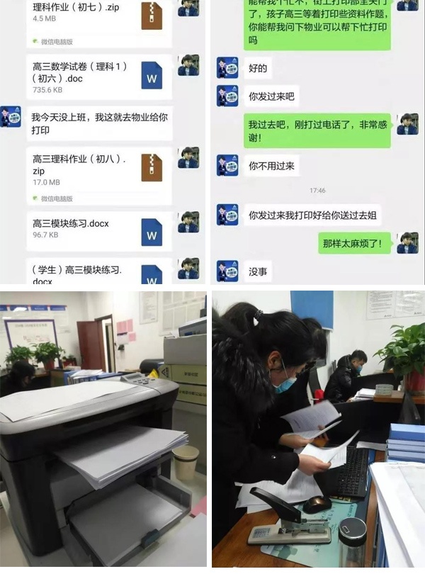 自線上開課以來,沈丘·建業(yè)城的一位業(yè)主就因老師布置的作業(yè)無法打印而焦頭爛額,她為此跑了半個(gè)城市,但是都沒有發(fā)現(xiàn)一家開門的打印店,正在一籌莫展之際,建業(yè)物業(yè)的管家闕可可聯(lián)系了她,幫助其打印了作業(yè)并及時(shí)送到家門口,這位業(yè)主感動不已,想留管家在家吃口熱乎飯……