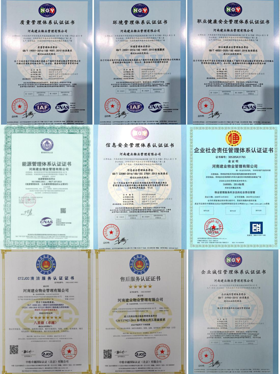 截至2021年1月21日,建業(yè)物業(yè)在原有的質(zhì)量、環(huán)境、職業(yè)健康安全、信息安全、社會(huì)責(zé)任、能源管理六標(biāo)認(rèn)證的基礎(chǔ)上,對(duì)清潔服務(wù)、售后服務(wù)、企業(yè)誠(chéng)信管理體系進(jìn)行相關(guān)認(rèn)證工作,并順利取得證書(shū)。