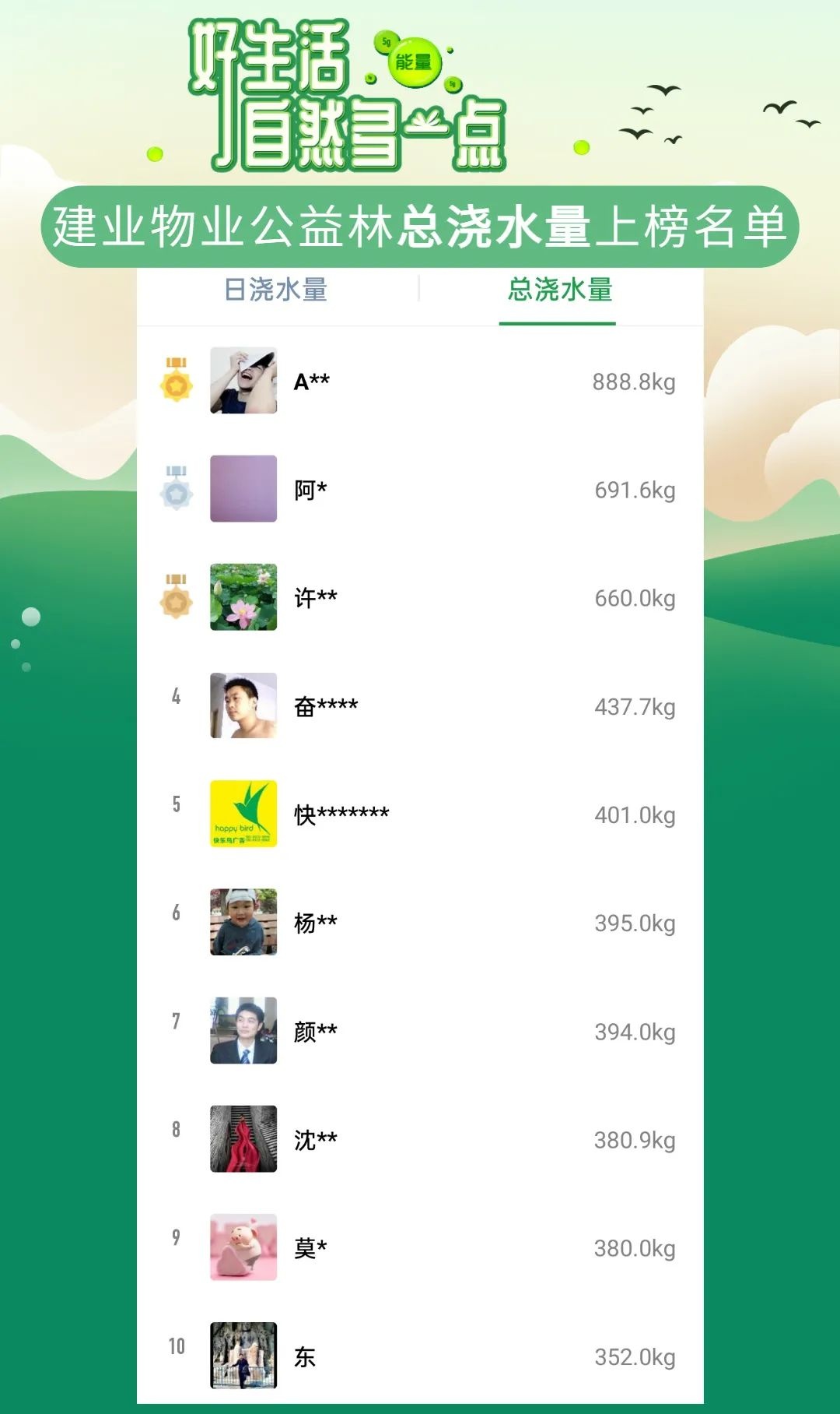 支付寶【螞蟻森林】建業(yè)物業(yè)公益林低碳打榜賽活動(dòng)雖已結(jié)束,但業(yè)主的熱情依然不減,在日常生活中踐行低碳的生活方式,并持續(xù)為建業(yè)物業(yè)公益林澆水,為公益事業(yè)貢獻(xiàn)力量。