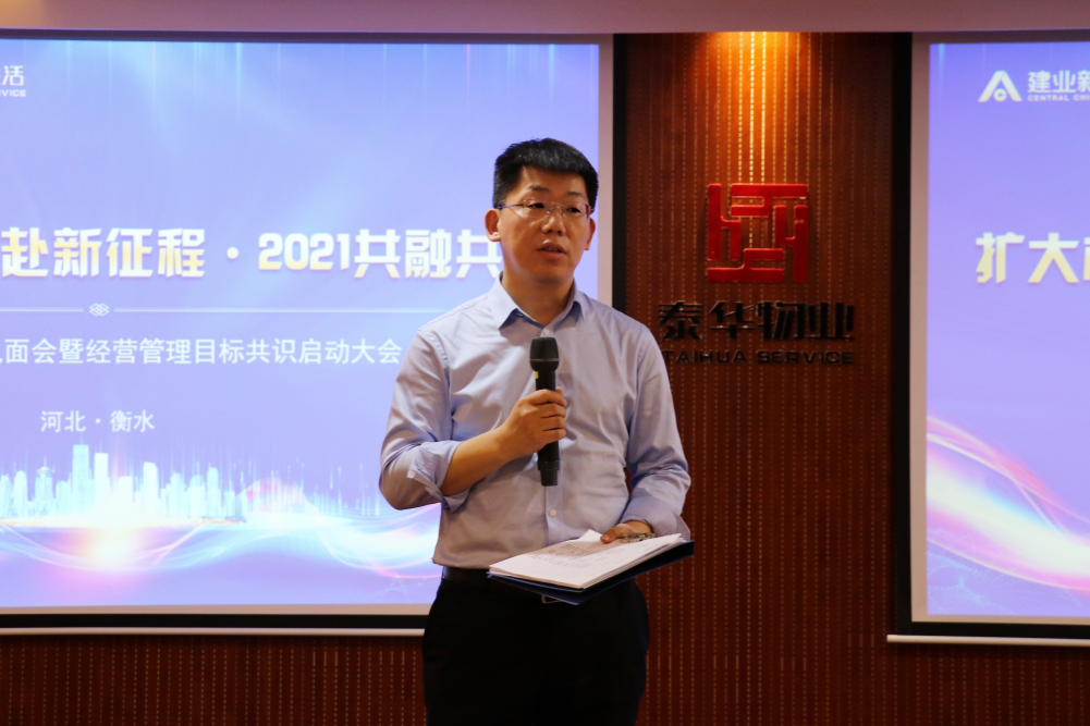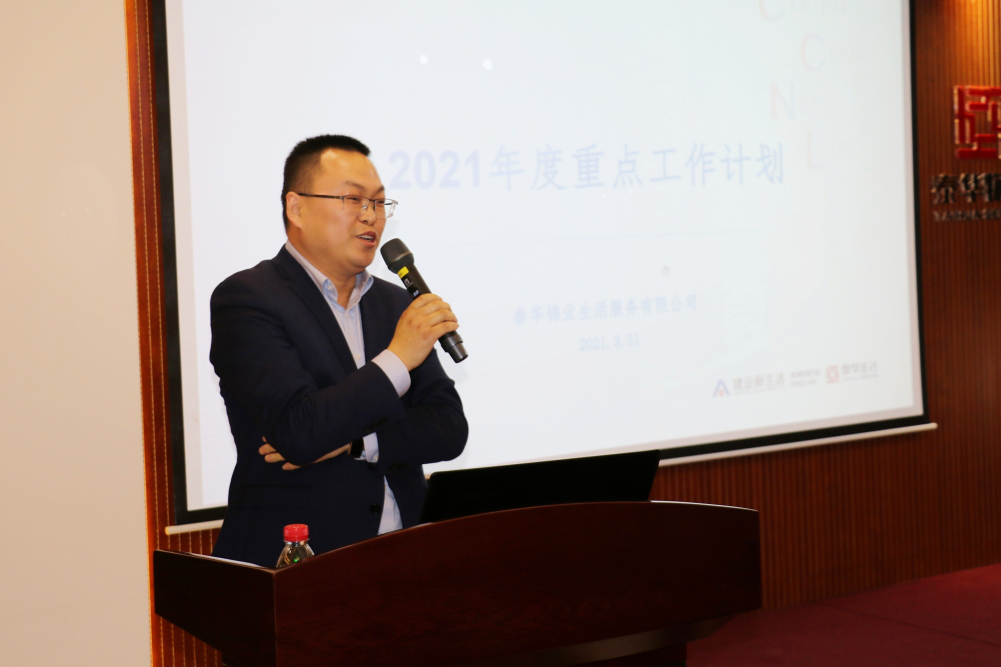 緊接著,泰華錦業(yè)生活常務副總經理李亮亮圍繞泰華錦業(yè)生活2021年度重點工作計劃進行匯報。匯報中,李總明確了泰華錦業(yè)生活未來三年發(fā)展的核心業(yè)績指標,提出“穩(wěn)定主營收入、縱深推進增值服務”的經營策略,“西進北上奔赴京津冀、擴大根據(jù)地”的市場發(fā)展戰(zhàn)略,同時圍繞聚焦融合、凝聚團隊、降本提質增效,案場煥新行動、新長征100人才戰(zhàn)略、創(chuàng)新發(fā)展、對標學習、建業(yè)大服務體系體驗、行業(yè)課題研究以及紅色物業(yè)城市運營商等內容進行匯報。