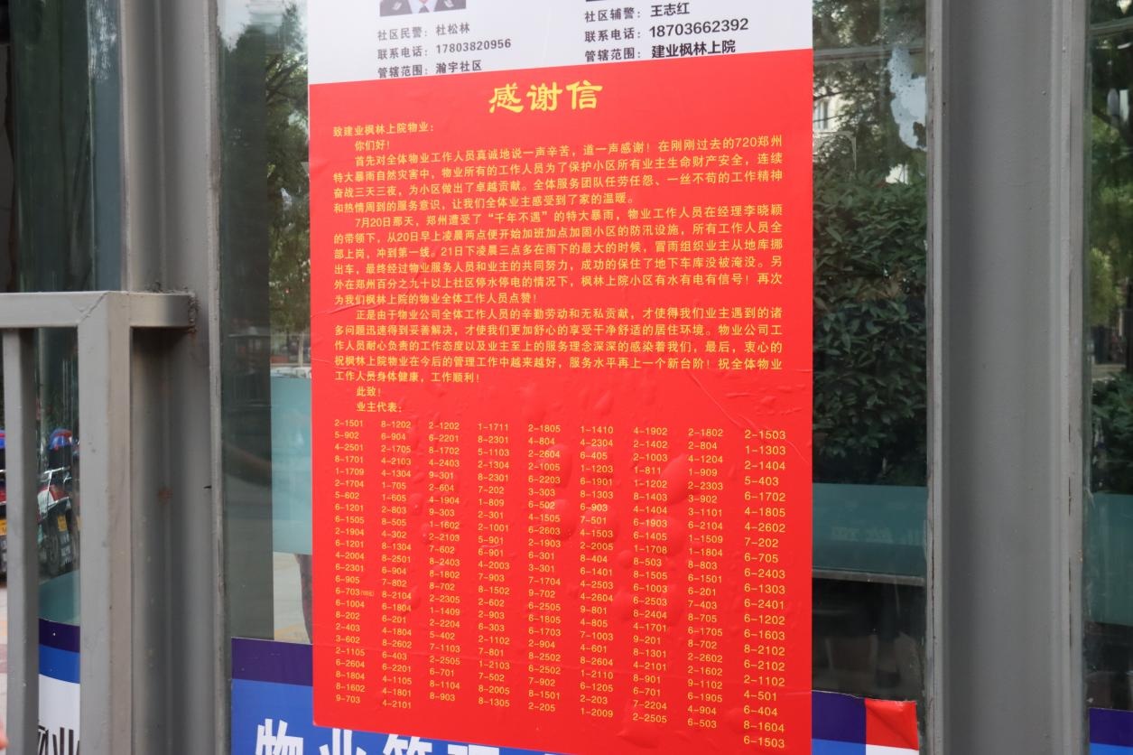 小區(qū)業(yè)主謝女士說(shuō):“物業(yè)在這次防汛中付出了很多,保障了我們的正常生活,孩子學(xué)校的其他家長(zhǎng)都羨慕我們?cè)谘辞槠陂g還能正常上網(wǎng)課?!彪S后,她拿起手機(jī)向我們展示,在業(yè)主組建的微信群里,大家自發(fā)組織為物業(yè)送錦旗、送感謝信,業(yè)主們?cè)谌豪锝育垐?bào)名,想要當(dāng)面表達(dá)對(duì)物業(yè)的感謝。