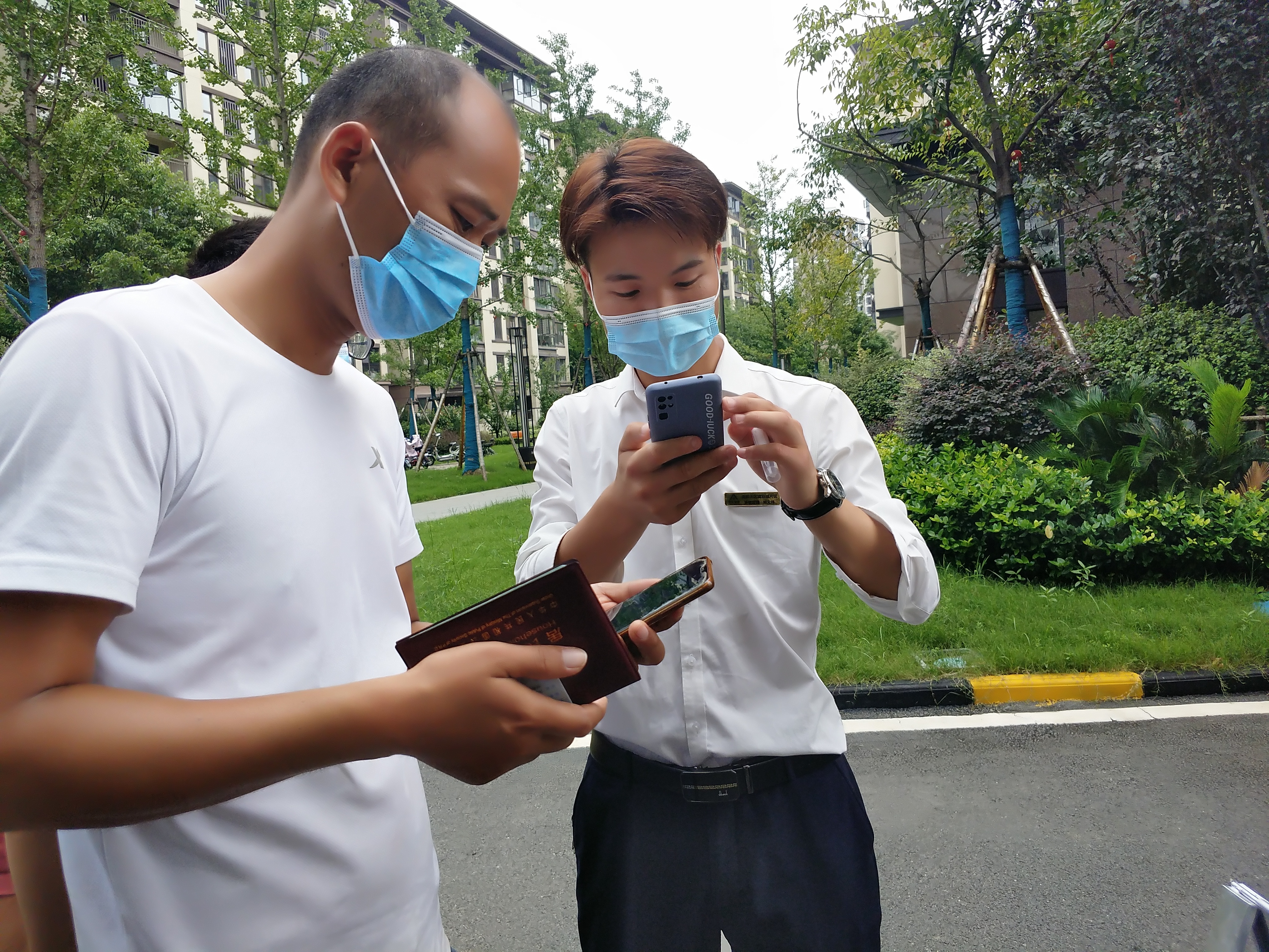 左一為商丘·聯(lián)盟新城管家王帥正在用手機核對業(yè)主信息