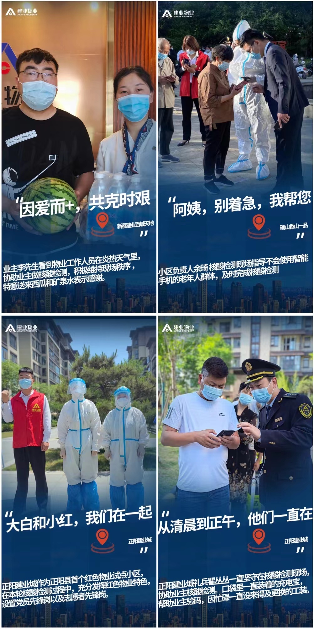 建業(yè)物業(yè)人聯(lián)動著小區(qū)與外界,在無數(shù)個困難面前,他們都不曾退縮。特殊人群的核酸檢測,物業(yè)管家主動協(xié)同醫(yī)護(hù)人員開展,防護(hù)雖少,但勇氣足夠多。