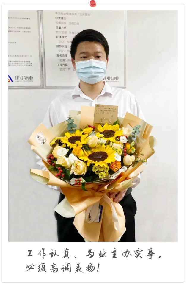 這是本輪疫情后建業(yè)物業(yè)在駐馬店收到的第一束鮮花,它既代表著業(yè)主對建業(yè)物業(yè)的認可,更承載了一個美好的愿望:疫情終將結(jié)束,鮮花終會在每個人心中盛開。