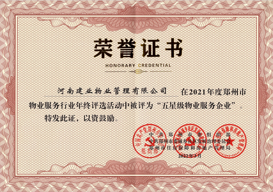 日前,由鄭州市委組織部、鄭州市委城鄉(xiāng)社區(qū)發(fā)展治理委員會、鄭州市住房保障和房地產(chǎn)管理局聯(lián)合舉辦的2021年度鄭州市物業(yè)服務(wù)行業(yè)年終評選活動(dòng)公布結(jié)果,河南建業(yè)物業(yè)管理有限公司順利斬獲“五星級物業(yè)服務(wù)企業(yè)”榮譽(yù)稱號。