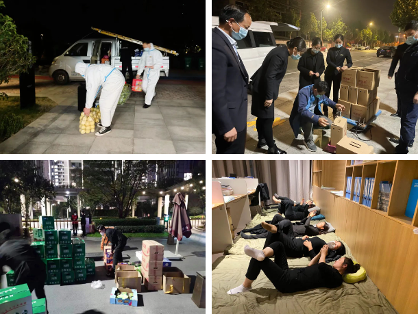 凌晨五點(diǎn)多,在橘黃的路燈下,建業(yè)物業(yè)人已開始布置核酸現(xiàn)場(chǎng),直到深夜,他們?nèi)栽诖虬诙煲偷奈镔Y。靜默期間吃住在小區(qū)的建業(yè)物業(yè)人,醒來就奔波在園區(qū)里,深夜就席地而睡,他們猶如一簇簇燭火,在黎明到來之前,用微光照亮城市。