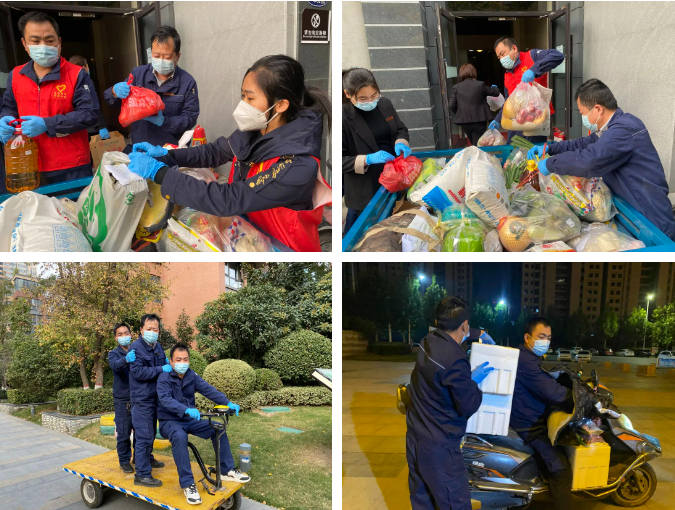因?yàn)橐咔楣芸兀?1號樓1單元的122戶業(yè)主被封控在家。他們一戶戶統(tǒng)計業(yè)主物資需求,統(tǒng)一進(jìn)行購買和配送。物資到位后,他們又全員上陣,先按照樓層進(jìn)行分類,再由5名維修工穿著密不透風(fēng)的防護(hù)服,一趟趟地穿梭在小區(qū)里。為了提高效率,三輪車、電動車都被利用起來,只為盡早將物資運(yùn)送到業(yè)主手中。