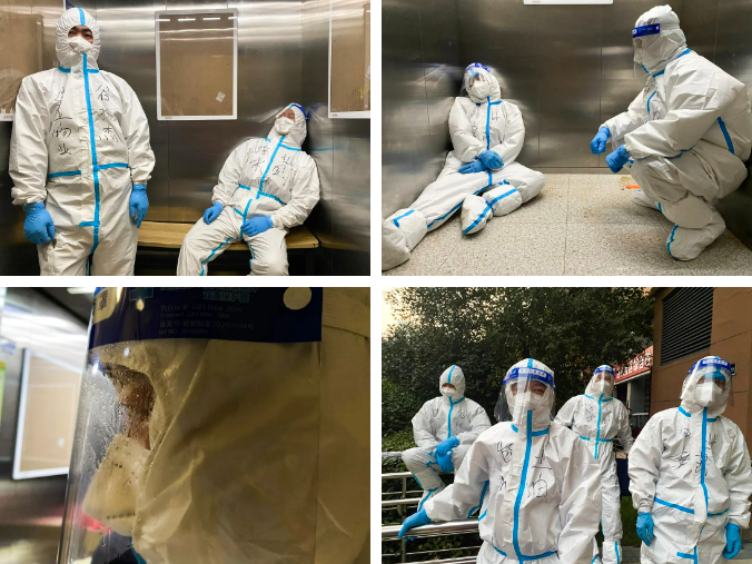 從小區(qū)門口到單元門口,再到各家各戶,已經(jīng)忙碌了一天的他們現(xiàn)在明顯有些體力不支,腳步也變得沉重了許多。身體不適的王利鋒蹲在地上喘著粗氣,卻還在安慰同伴:“我蹲一會兒就好,放心,我沒事!”忙完配送工作,他們幾個人都累得癱坐在電梯里。