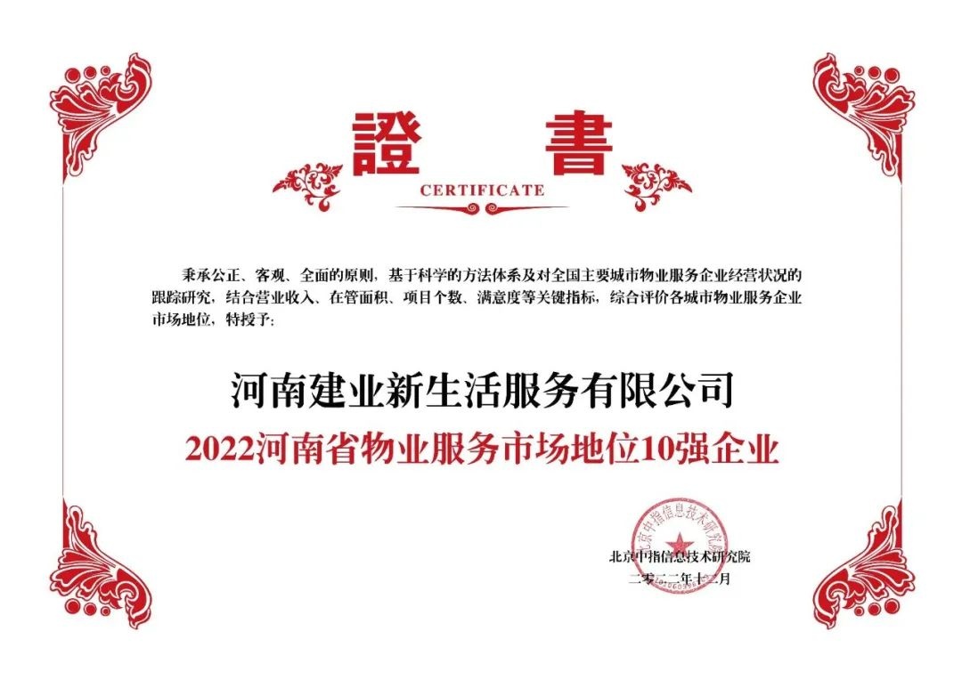 建業(yè)新生活憑借多年以來在中部地區(qū)穩(wěn)扎穩(wěn)打的表現(xiàn)榮獲“2022中部區(qū)域物業(yè)服務(wù)市場(chǎng)地位領(lǐng)先企業(yè)(TOP1)”“2022河南省物業(yè)服務(wù)市場(chǎng)地位10強(qiáng)企業(yè)(TOP1)”。