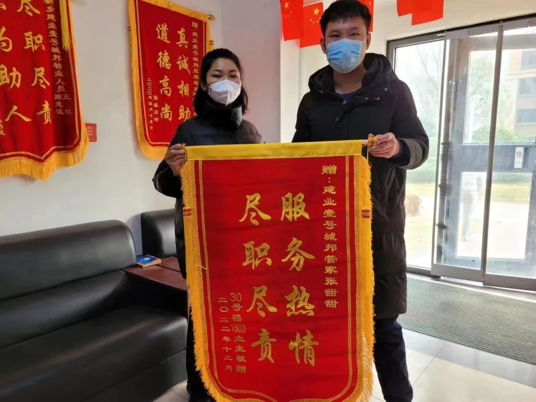 “鼎力相助,有求必應(yīng)” “排憂解難,情系業(yè)主” “服務(wù)熱情,盡職盡責” …… 12月8日,剛剛解封不久的新鄉(xiāng)·建業(yè)壹號城邦物業(yè)服務(wù)中心內(nèi),業(yè)主代表們將21面鮮紅的錦旗送給了貼心管家張?zhí)鹛?,對她在疫情封控期間的無私奉獻及日常服務(wù)中的盡職盡責表達感謝。 是她的負責,保障了我們特殊時期的安全 在前段時間的疫情管控中,張?zhí)鹛鹚撠煹臉菞潈?nèi)出現(xiàn)了確診病例,按照當時的政策,需要對整個單元進行封控,張?zhí)鹛鸨愠袚鹫麄€樓層的消殺、物資配送等工作。在配送物資時,張?zhí)鹛鸢l(fā)現(xiàn)有的業(yè)主并沒有按照防疫要求足不出戶,便主動勸導業(yè)主進行嚴格的居家隔離,避免病毒進一步擴散。 與此同時,張?zhí)鹛疬€時刻關(guān)注著被感染業(yè)主的健康情況,在被感染